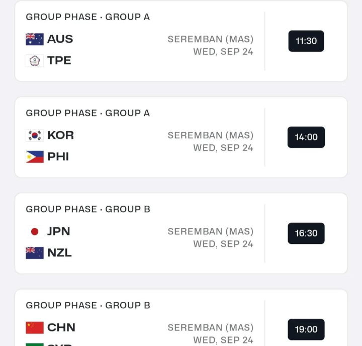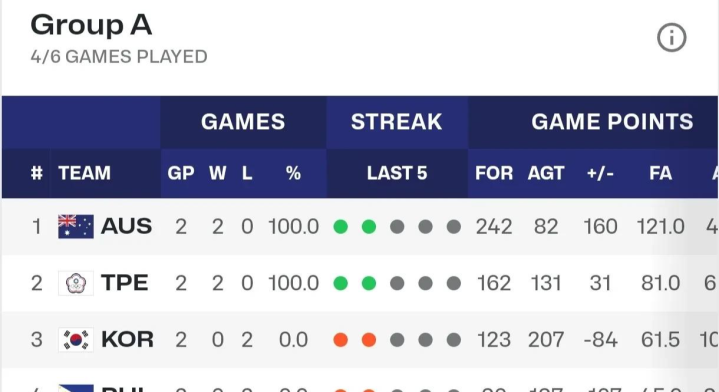 首先看A组排名,澳大利亚目前排名第1,中国台北排名第2,韩国第3,菲律宾第4。